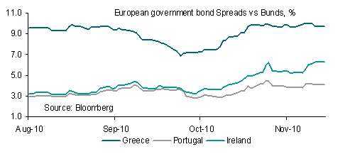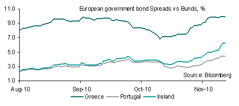 As has been the case since the beginning of the global financial crisis policy makers have found themselves under pressure to deliver a solution to a potentially destabilising or even systemic risk before the markets open for a new week in order to prevent wider contagion. Last night was no different and following urgent discussions a EUR 85 billion bailout for Ireland to be drawn down over a period of 7 ½ years was agreed whilst moves towards a permanent crisis mechanism were brought forward. As was evident over a week ago a bailout was inevitable but the terms were the main imponderable.