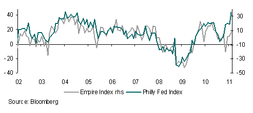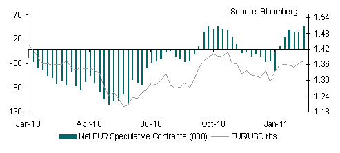 A likely pre-emptive strike from the ECB cannot be ruled out. Two rate hikes in H2 2011 are now likely even as the Bank maintains liquidity support for weaker peripherals. No change in policy but a hawkish press statement on Thursday will on the face of it play for a firmer EUR but i) the fact that the market has already discounted the possibility of early rate hikes and ii) the proximity of the US payrolls data on Friday and iii) uncertainty over the impact of the Irish election outcome in which the Fine Gael party won a clear victory, suggest that EUR risks are asymmetric. The net long positioning overhang also points to some downside risks to EUR.