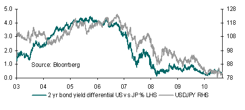 Fortunately for the USD only USD/JPY and USD/CHF have maintained a statistically strong correlation with bond yield differentials although we expect the break in relationship for other currencies to prove temporary. In the case of USD/JPY, yield differentials have narrowed between the US and Japan, a factor playing for JPY appreciation.