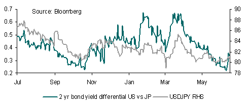 USD/JPY is the only major currency pair that is correlated with bond yield differentials at present (2-year yields) and therefore it should not come as a surprise that USD/JPY has moved higher as the yield differential between the US and Japan has widened by around 10bps over the past week. Indeed, yesterday’s move above 81.00 was spurred by the move in yield differentials although once again the currency pair failed to build sufficient momentum to close above this level.