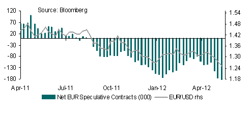 The contrast in the outlook for the US and Eurozone has been reflected in a significant shift in speculative positioning. CFTC IMM data reveals an all time high in speculative US positioning but in contrast an all time low in EUR positioning. The USD is winning by being a less ugly currency than the EUR and for now the markets are content to ignore US problems. This is set to continue over coming weeks.