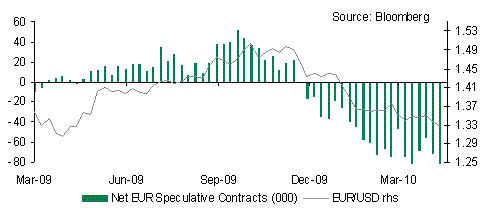 In Europe there is not much in terms of first tier releases and highlights include sentiment data such as German Gfk and French consumer confidence indices, and the May French business confidence indicator. The data are likely to be mixed, and as indicated by last week’s surveys will reflect a relatively healthy Q2 2010, but a worsening outlook for the second half of the year.