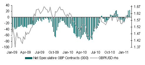 Although the EUR may get a brief lift from the news of the resignation of Egypt’s President Mubarak this will likely prove temporary. Given that tensions are beginning to creep higher EUR/USD may struggle to make any headway this week and will more likely slip below 1.3500 for a test of 1.3440 as sentiment sours. Even the usual sovereign interest may look a little more reluctant to provide support this week. The net long positioning overhang as reflected in the CFTC IMM data suggests some scope for a squaring in long positions, likely accelerating any downside pressure.