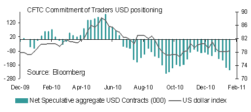 The positive impact on the USD may be dampened however, by benign inflation readings this week, supporting the view that US policy rates will not be raised for a long time yet. This is likely to be echoed in the Fed FOMC minutes this week. Nonetheless, speculative positioning suggests plenty of scope for short USD covering, with the latest CFTC IMM report revealing the biggest net short position since October 2010.