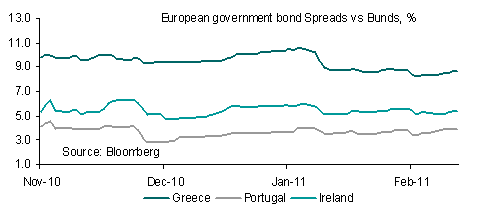 One theme that has been evident since the start of the year is an improvement in sentiment towards the eurozone periphery as hopes of an enlargement/extension of the European Union bailout fund (EFSF) have increased. This is a key reason why the EUR has strengthened this year although nervousness on this front appears to have returned over recent days (note the recent widening in peripheral bond spreads, drop in EUR and European Central Bank purchases of Portuguese debt). It seems that a lot of good news has already been discounted in relation to the eurozone periphery and now markets are in wait and see mode for the EU Council meeting on 24/25 March. There is a strong chance that eventually market expectations will prove overly optimistic and the EUR will drop but more on that later.