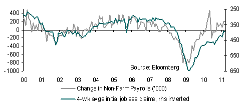 The eurozone periphery remains in the eye of the storm but markets may have to wait before any concrete action is taken. The possibility of increasing the size of the bailout fund (EFSF), preparation of new European bank stress tests and/or allowing the EFSF to purchase eurozone government debt are all on the table but so far agreement has been lacking. Ministers apparently rejected the idea of increasing the size of the fund from EUR 440 billion to EUR 750 billion whilst disagreement over stricter criteria may also be hampering any progress.