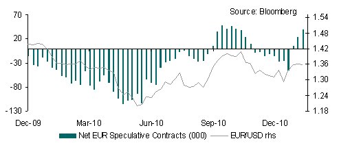 Even the mixed US January jobs report has failed to dent market sentiment; the smaller than expected 36k increase in payrolls was largely attributed to severe weather. A further surprising drop in the unemployment rate to 9.0% due mainly to a significant drop in the labor force was also well received by the market.